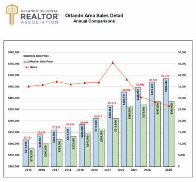 Total home sales in the Orlando area finished the year at approximately 26,700 transactions, marking the lowest sales volume since 2009. To put that into perspective, the last time Orlando saw this few sales, the average home price was around $130,000.
